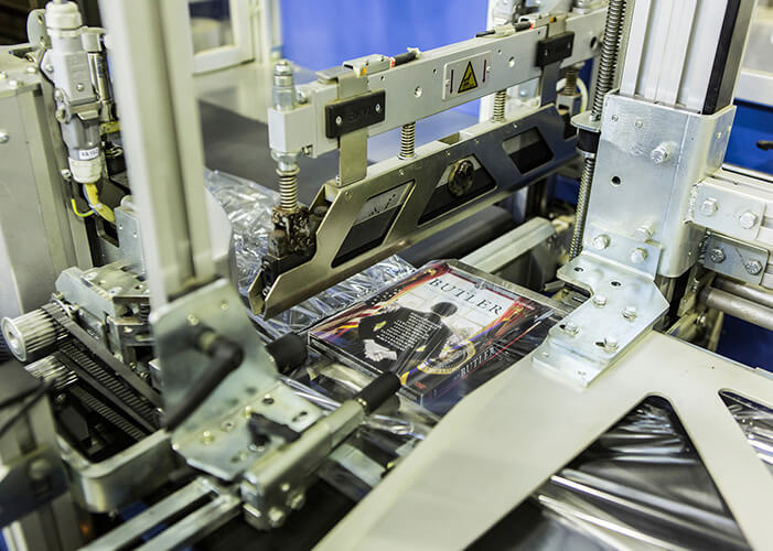 Unsere 12 vollautomatischen Cellophanmaschinen der Hersteller Sollas und Ilsemann verarbeiten täglich bis zu 250.000 Exemplare und zeichnet diese auf Wunsch mit dem „Grünen Punkt“ oder anderen Recycling Symbolen aus.